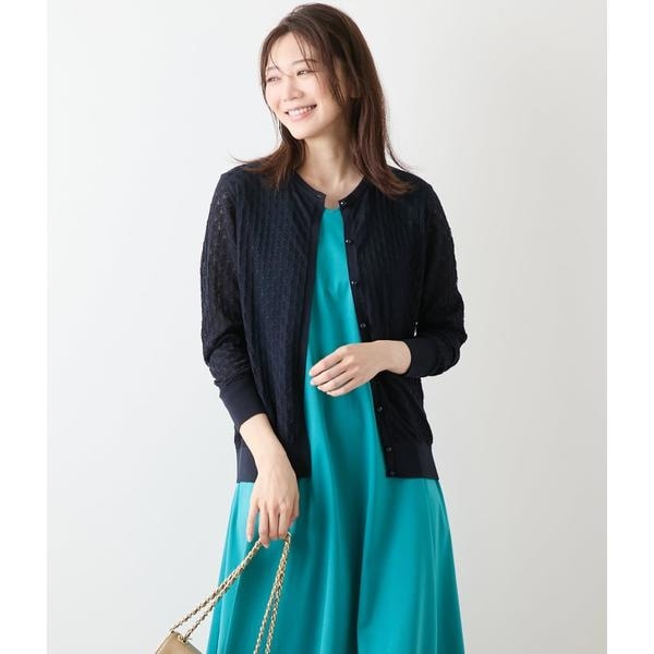 ベーシックなクルーネックの長袖カーディガン。繊細な透かし柄を袖や後ろ身頃まで全面に配し、表情豊かに仕上げました。フロントには表面のカットがきらりと光るボタンを配し、さりげないアクセントに。ボタンを留めればプルオーバー風の着こなしも可能です。