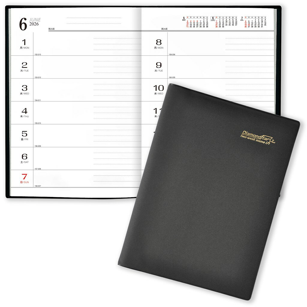 【サイズ】B5(26.6x19cm)【ページ数】176【カバーの色】黒【カバーの素材】ソフト・ビニール【本文用紙の色】白【製本方法】無線とじ【タイプ】2週間【曜日始まり】月曜始まり【暦掲載情報】吉日等暦情報 / 長寿の祝・結婚記念日年齢早見表 / 災害時の連絡方法 / 日本全図世界地図と時差表 / 晴雨表 / 全国高速道路図主要都市高速道路図(首都高・阪神・名古屋)主要都市周辺路線図(東京・大阪・名古屋)地下鉄路線図(東京・大阪・名古屋・札幌・横浜・仙台・神戸・京都・福岡)【商品詳細説明】2週間単位で記録が残せる、B5サイズ・無線とじ製本の2週間タイプ。翌週の予定や、前の週の予定をチェックしやすいのがこの手帳の特徴です。ベーシックな黒の装丁なので、ビジネスはもちろんプライベートにも使える、カレンダー専門メーカーが作った暦情報満載の手帳です。※【仕様替】表紙がソフトビニールのカバーに変更となりました。以前の商品に比べ見た目や質感に違いがありますので、ご了承ください。(C)TODAN登録商標 第5028164号