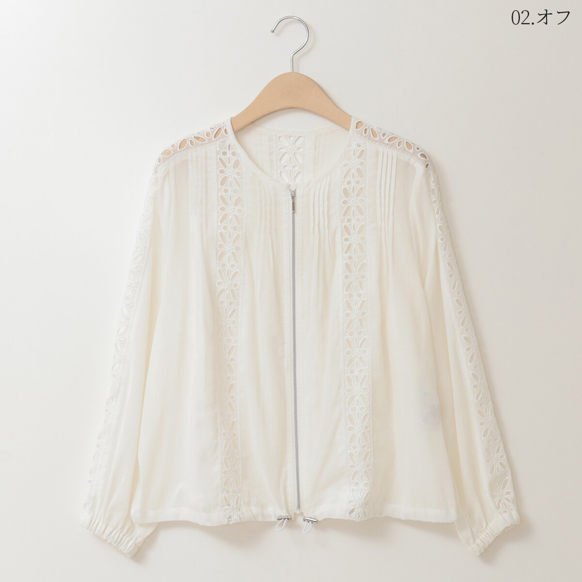 アイレット刺繍とピンタックでアクセントを効かせたライトブルゾン。