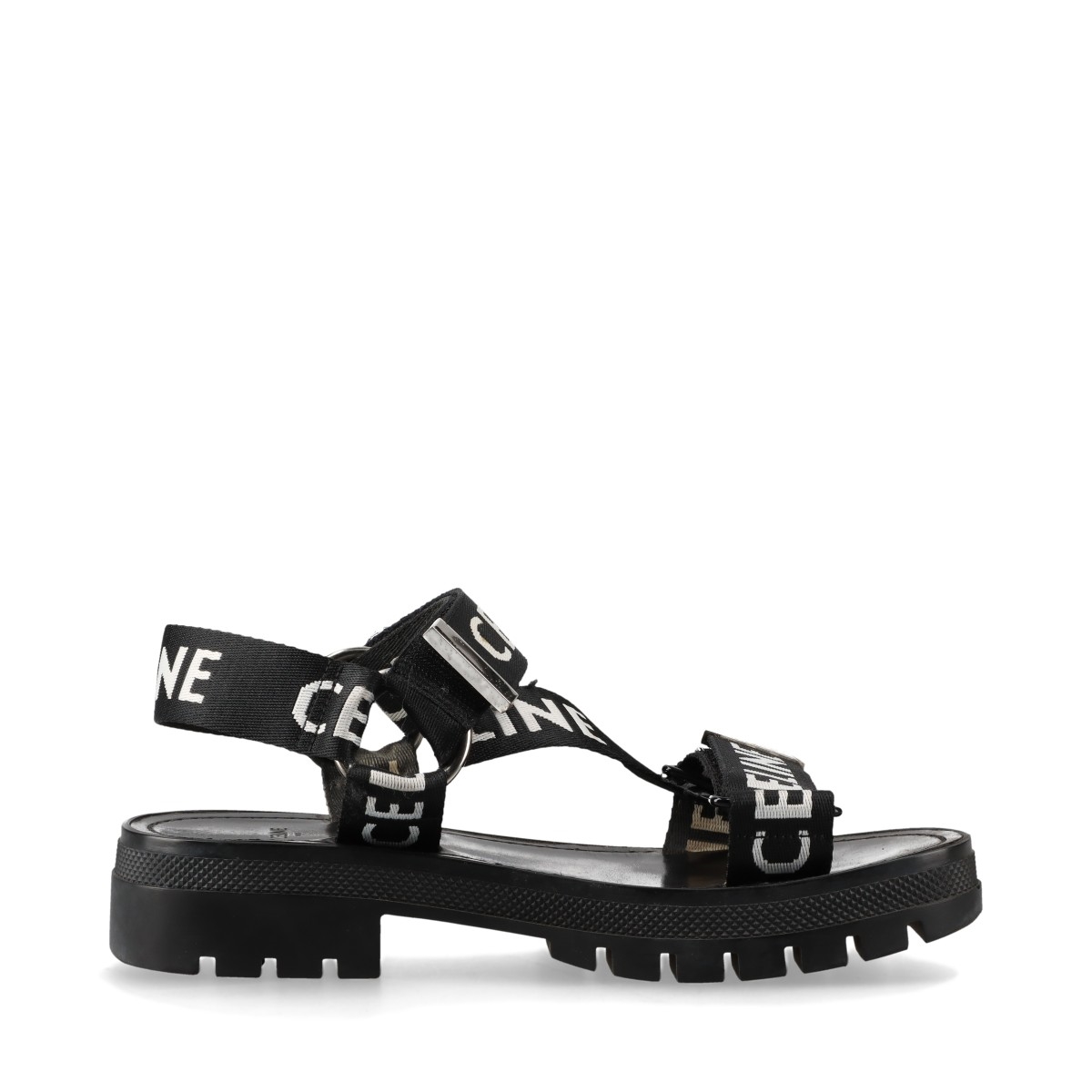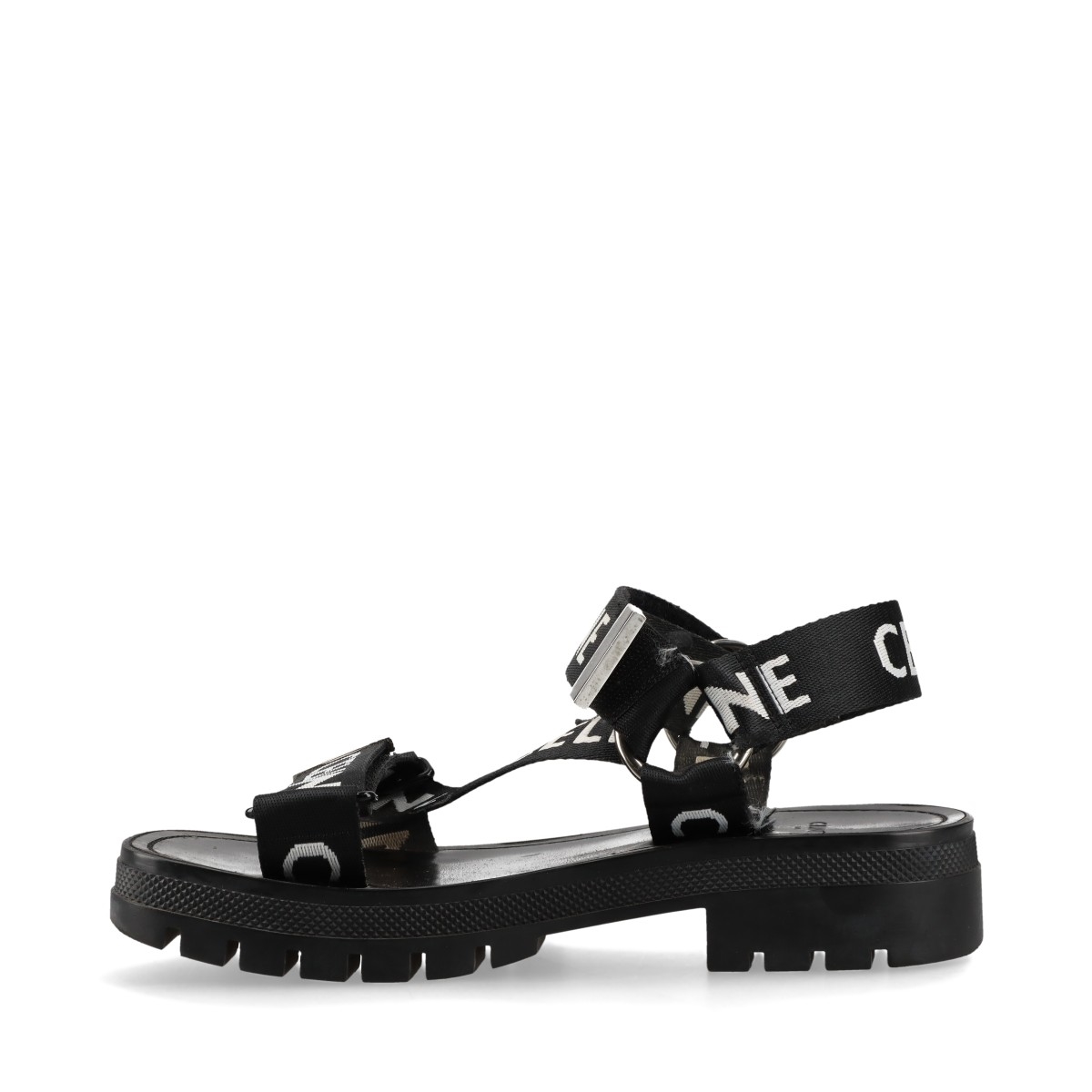M10458 セリーヌ レオ ストラッピー ファブリック レザー ロゴ ベルクロ サンダル ブラック