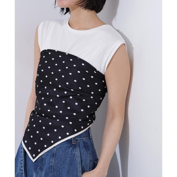 規則的なポルカドット柄の大判スカーフです。ヘッドアクセサリーとしてや、腰に巻くこともできるサイズ感で、アレンジ力が高いアイテムです。※モデルの着用画像の場合、光の当たり具合により、実際の色味と異なって見えることがございます。色味は、商品単体の画像をご参照ください。
