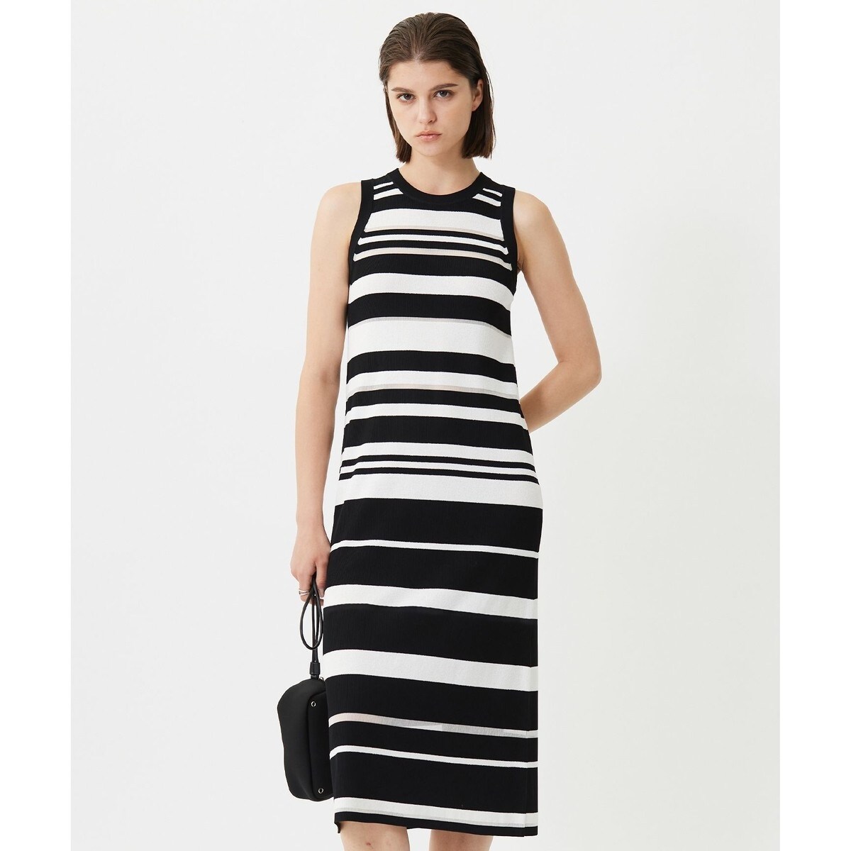 ■デザイン3種の異なる表情と質感の糸をマルチにランダムに配したICBオリジナルのボーダーニットワンピース。ランダムで動きのあるボーダーピッチが軽やかで、高級感ある印象です。縦長のサックドレスシルエットに、デコルテラインとショルダーラインがきれい見えするよう、リブ付属のカッティングにもこだわりました。ジレなどを合わせたスタイリングや、パンツにレイヤードしてスタイリッシュに着ていただくのもおすすめです。