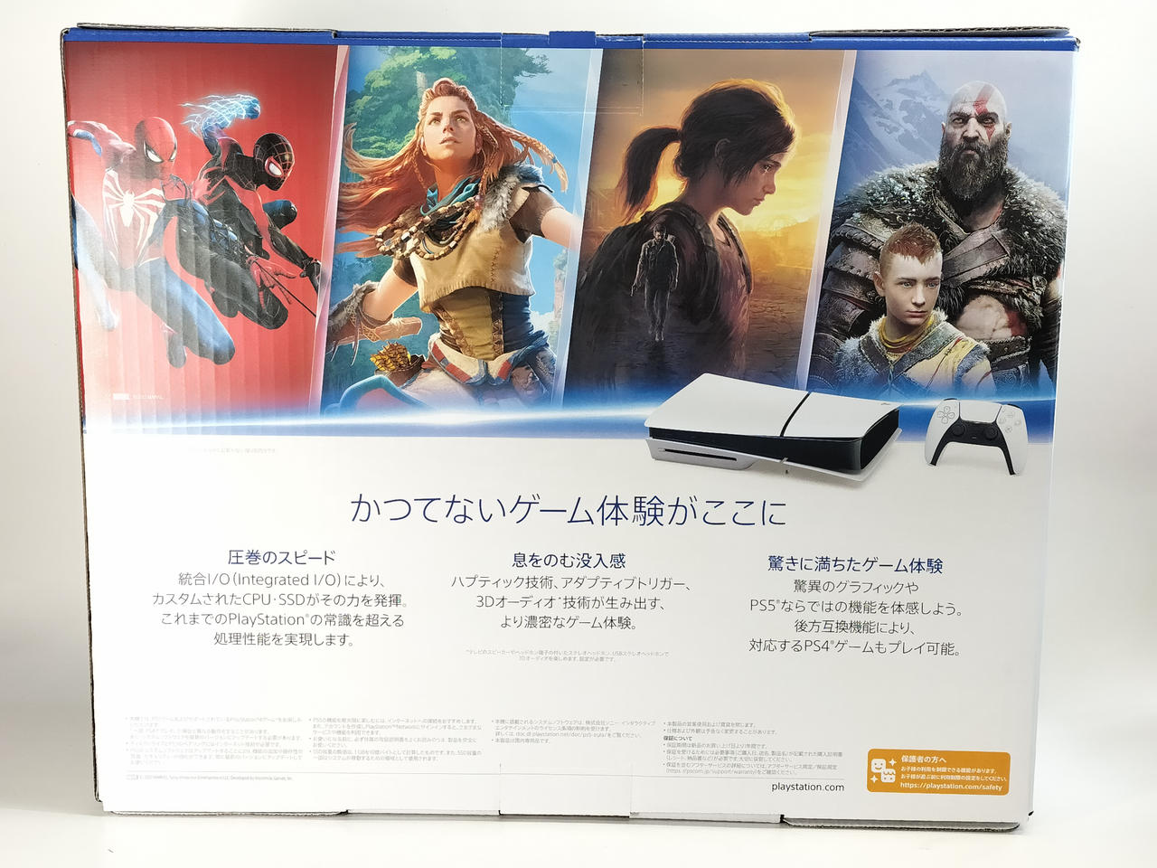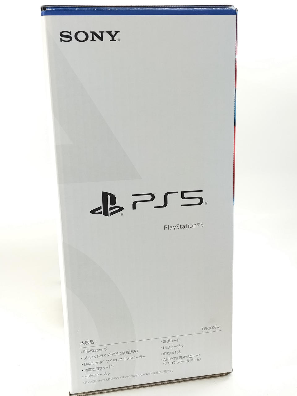 付属品:  化粧箱、DualSenseワイヤレスコントローラー、横置き用フット×2、HDMIケーブル、電源コード、USBケーブル、印刷物一式