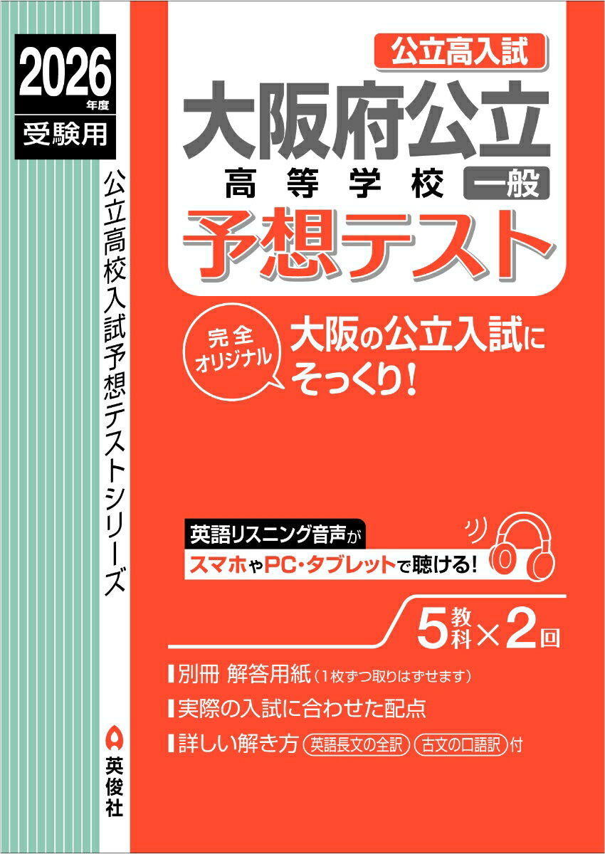 ●本書の特長英俊社完全オリジナル。問題構成(問題数・問題の配列),出題傾向(出題形式・難易度),レイアウトなど,すべて大阪の公立入試そっくりに作りあげた予想テストです。1.英語C問題のリスニングに対応2.数学・英語・国語は難易度別にA(基礎)・B(標準)・C(発展)の3種類の問題を収録3.5教科×2回収録4.採点しやすい別冊の解答用紙(1枚ずつ取りはずせます)5.くわしく分かりやすい解説(英語長文の全訳,古文の口語訳付)●リスニング音声について本書に掲載のリスニング音声は英俊社サイト内の専用ページ<リスもん>で再生することが出来ます。(無料)※コードの使用期限: 2027年3月末日