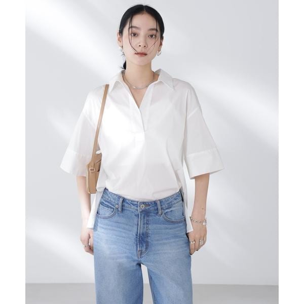 ワイドな身幅に短めの丈バランスがモード感あるスキッパーシャツ。袖口後ろ側にはスリットが入っているので、軽くロールアップすることも可能。シャツのきちんと感にワイドスリーブやスキッパーで抜け感を加え、オンオフ問わず使える万能な一枚です。