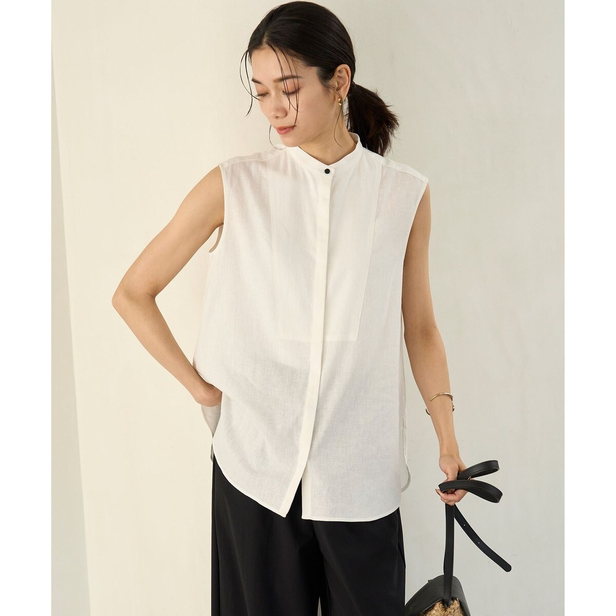 マニッシュな印象で、大人も着やすいノースリーブブラウス