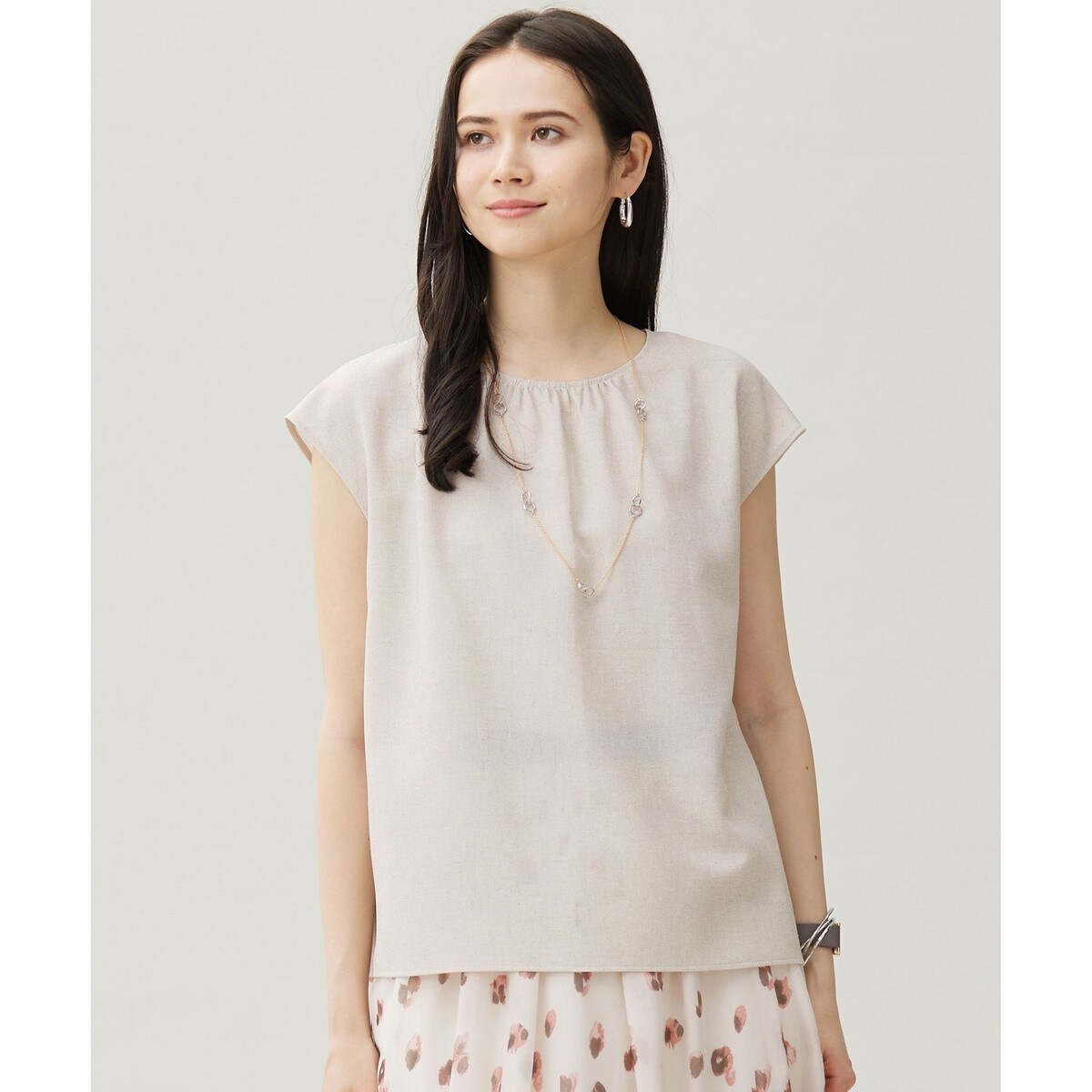 後ろのボウタイが目を惹く華やかなブラウス■デザイン後ろ姿が印象的なプルオーバーブラウスです。後ろ襟ぐりのボウタイを結んで着用する、バックシャンなデザインです。フロントはシンプルにギャザーを寄せた、程よく華やかな印象になっています。アウターを羽織らない時期ならではのディテールで、1枚で着映えるブラウスです。■素材アセテートと梳毛調のポリエステルを使ったメッシュ素材です。スラブ糸を一緒に織り込むことで、麻のようなナチュラルな表情と繊細な立体感、リラックスしたストレッチ感があるのが特長の素材です。■同素材アイテムドルマンスリーブTブラウス(BLWMGA0103)