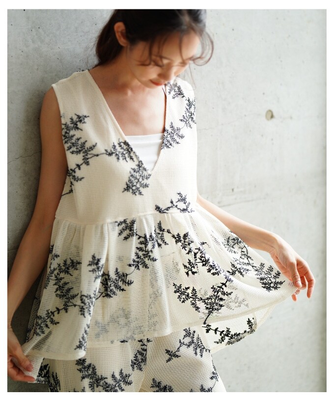 繊細なリーフ刺繍がナチュラルなメッシュVネックフレアトップス。軽やかな透け感が上品でふんわりと広がるシルエットが女性らしさを引き立てます。前後差のあるデザインで、動くたびに表情が変わるのも魅力。カジュアルにも綺麗めにも着こなせる万能アイテムです。トレンド感のあるレイヤードスタイルにもおすすめ。