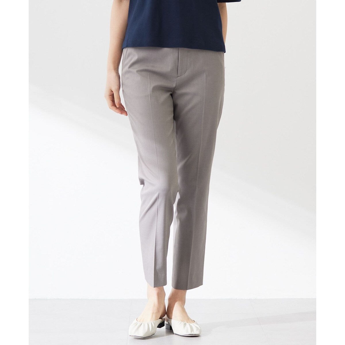 スタイリッシュなデザインでオンオフ兼用のテーパードパンツ。ウエストの上端をウエストライン位置になるように股上を深くして、安心感のある履き心地に仕上げました。後ろウエストはゴム入りのため、着用感も楽でありながら、センタープレス入りなのでキレイ目なシルエットです。同素材のジャケットとのセットアップにも対応しています。裏地なしです。カラーは、清潔感のあるライトグレー(#003)、シーンレスに活躍するブラック(#005)、他アイテムとも合わせやすいブラウン(#030)、女性らしい柔らかな印象のベージュ(#033)、洗練された雰囲気のダルブルー(#074)、ベーシックなネイビー(#075)の6色で展開。レギュラーサイズのみMサイズとLサイズで4cm程股下を変え、お好きな方をお選びいただけます。LサイズはWEB限定となります。※ウエスト等その他の寸法は同じです。