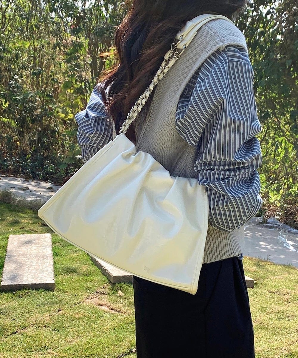 柔らかく、上品な質感が特徴です。シンプルでありながら、チェーンストラップがアクセントとなり、個性をプラス。軽量でコンパクトながら、日常使いに十分な収納力を備えており、財布やスマートフォン、小物などをしっかり収納できます。ショルダーストラップは調整可能なので、肩掛けでも手提げでもお使いいただけます。
