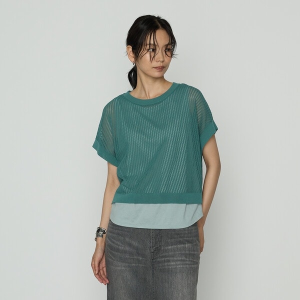 〈レイヤードニット〉レース柄のニットトップにカットソーのタンクトップをセットにしたコーディネート不要のレイヤードプルオーバーです。