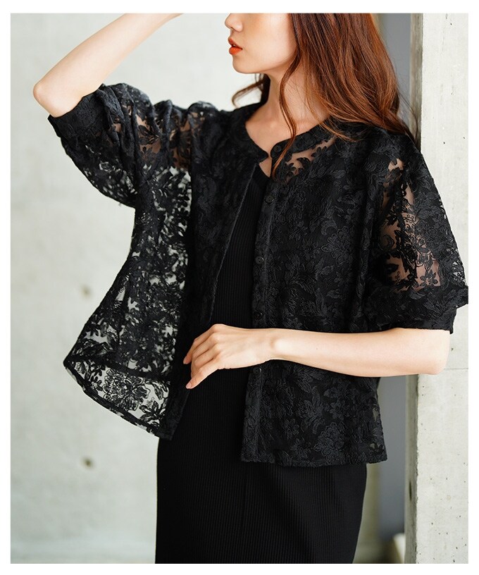 品のある花柄レースが女性らしさを演出する大人のシアーブラウス。ノーカラーの首元でお顔周りをすっきりさせ、ハイネックインナーとのレイヤードも相性抜群。ボタン開閉可能だから、羽織りとしても活躍します。ふんわりとボリューム感のあるスリーブで二の腕をカバーし、長過ぎず短過ぎないスッキリとした丈感でボトムスを選びません。レイヤードスタイルを盛り上げるレース生地だから、インナーをシフトするだけで雰囲気の変化を楽しめる一枚。花柄刺繍が一面に描かれ、重ねるだけで華やかさを加速させます。綺麗めなスタイリングには勿論のこと、デニムなどのカジュアルなスタイリングにもマッチ。透け感のある生地で涼し気な印象が漂う大人のレースブラウスです。