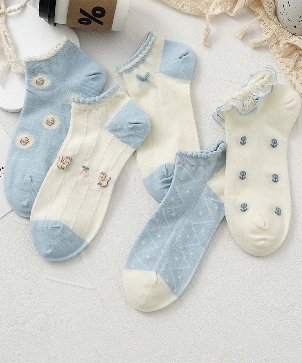 刺繍やフリル、チェック柄など、可愛らしいディテールがたっぷり詰まったガーリーソックスの5足セット。