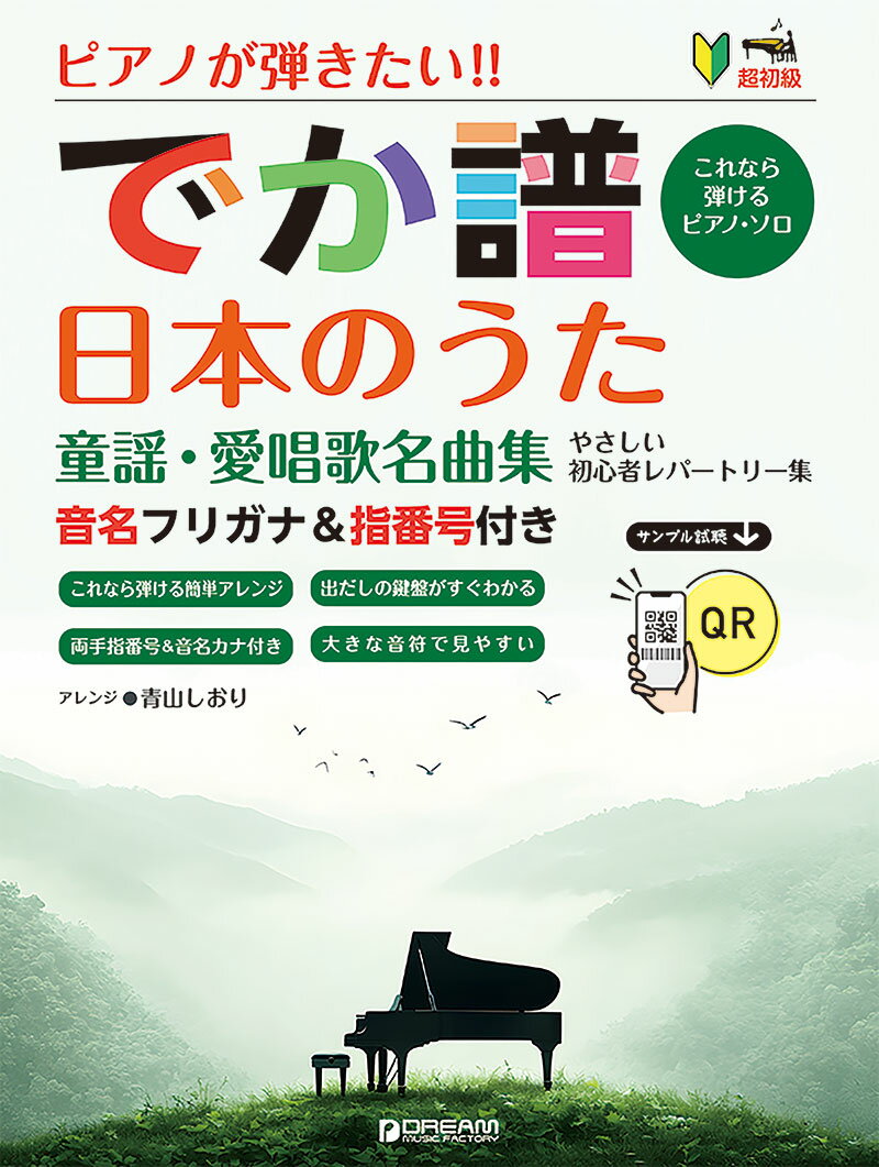 郷愁あふれる懐かしい曲の数々を、初心者でも演奏できるやさしいアレンジで集めました。見やすく大きな譜面と、音名ふりがな付きで楽しめるピアノ・ソロ曲集です。音名ふりがな・指番号付なので運指を確認しながら弾けます。ピアノをはじめて間もない方で、まだ五線譜に慣れていない方でも、音名を見ながらゆっくりと始めてみましょう!全曲、QRコードからサンプル演奏が試聴できます。01. 赤い靴02. 赤い鳥小鳥03. 赤とんぼ04. 海(うみ)05. 美しき天然06. おぼろ月夜07. 案山子08. かすみか雲か09. 風10. からたちの花11. 今日の日はさようなら12. 鯉のぼり13. 荒城の月14. 故郷の空15. 故郷の廃家16. 故郷の人々(スワニー河)17. 故郷を離るる歌18. この道19. さくらさくら20. 里の秋21. シャボン玉22. さくら貝の歌23. 叱られて24. 城ヶ島の雨25. 知床旅情26. 砂山27. 早春賦28. 竹田の子守唄29. ちいさい秋みつけた30. 茶摘31. 灯台守32. 鉄道唱歌(東海道編)33. とんび34. 夏の思い出35. 夏は来ぬ36. 七つの子37. 野ばら38. 箱根八里39. 初恋40. 花41. 花のまち42. 浜辺の歌43. 埴生の宿44. 浜千鳥45. 春の小川46. ふじの山(富士山)47. 冬景色48. 故郷 -ふるさとー49. ペチカ50. 星の界51. 牧場の朝52. 待ちぼうけ53. みかんの花咲く丘54. 紅葉 -もみじー55. 椰子の実56. 夕焼け小焼け57. 雪の降る街を58. 旅愁59. 宵待草60. 若葉61. 我は海の子01. 赤い靴02. 赤い鳥小鳥03. 赤とんぼ04. 海(うみ)05. 美しき天然06. おぼろ月夜07. 案山子08. かすみか雲か09. 風10. からたちの花11. 今日の日はさようなら12. 鯉のぼり13. 荒城の月14. 故郷の空15. 故郷の廃家16. 故郷の人々(スワニー河)17. 故郷を離るる歌18. この道19. さくらさくら20. 里の秋21. シャボン玉22. さくら貝の歌23. 叱られて24. 城ヶ島の雨25. 知床旅情26. 砂山27. 早春賦28. 竹田の子守唄29. ちいさい秋みつけた30. 茶摘31. 灯台守32. 鉄道唱歌(東海道編)33. とんび34. 夏の思い出35. 夏は来ぬ36. 七つの子37. 野ばら38. 箱根八里39. 初恋40. 花41. 花のまち42. 浜辺の歌43. 埴生の宿44. 浜千鳥45. 春の小川46. ふじの山(富士山)47. 冬景色48. 故郷 -ふるさとー49. ペチカ50. 星の界51. 牧場の朝52. 待ちぼうけ53. みかんの花咲く丘54. 紅葉 -もみじー55. 椰子の実56. 夕焼け小焼け57. 雪の降る街を58. 旅愁59. 宵待草60. 若葉61. 我は海の子
