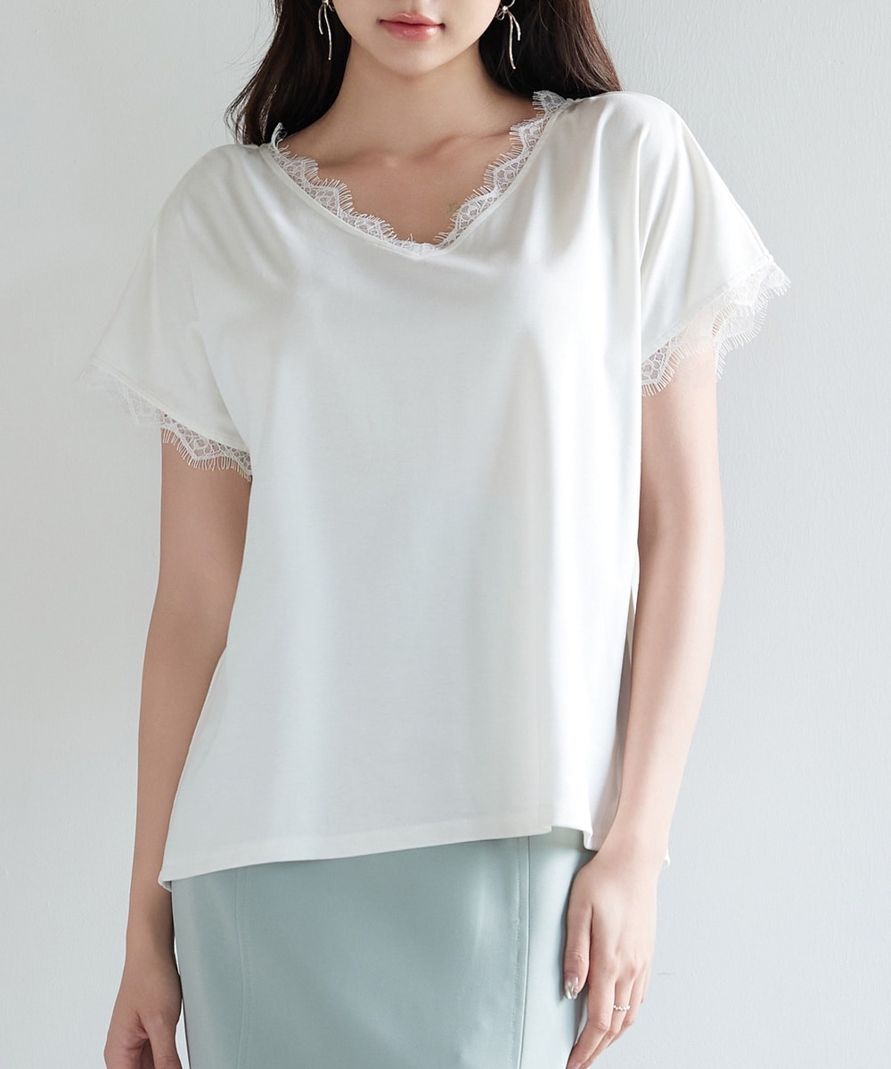 ネック部分と袖口部分にはレースがあしらわれています。シンプルなTシャツにさりげなくエレガントな要素を取り入れたデザインです。