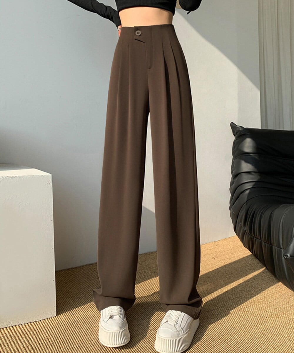ウエストボタンのディテールが目を引く、立体的なシルエットが美しいハイウエストのタック入りスラックスパンツ。