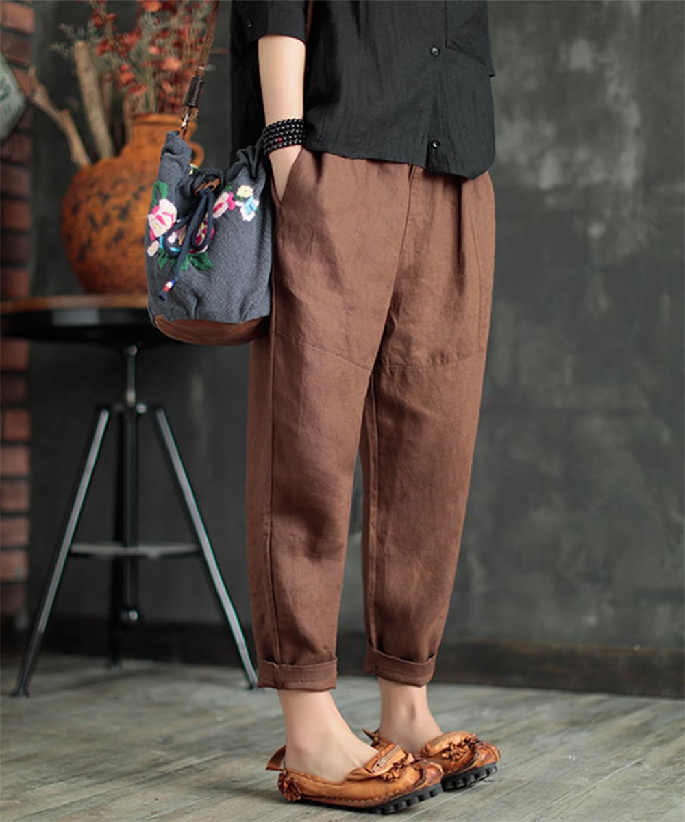 綿と麻をブレンドした生地で、涼しげな素材感とナチュラルな質感の風合いがあって、サラッとした穿き心地 ウエストゴムで着脱簡単、体型により調整自由。前と後の両サイドにポケット入って便利な9分丈パンツです。 ウエストはシャツインがきれいに決まる仕様でおしゃれ度UP。シャツやTシャツなどいろんなアイテムとも合わせやすい。 シンプルデザインで、通勤や普通のお出かけなどの場合に最適なロングパンツです。薄手で軽量のため、春~秋は快適なアイテムです。