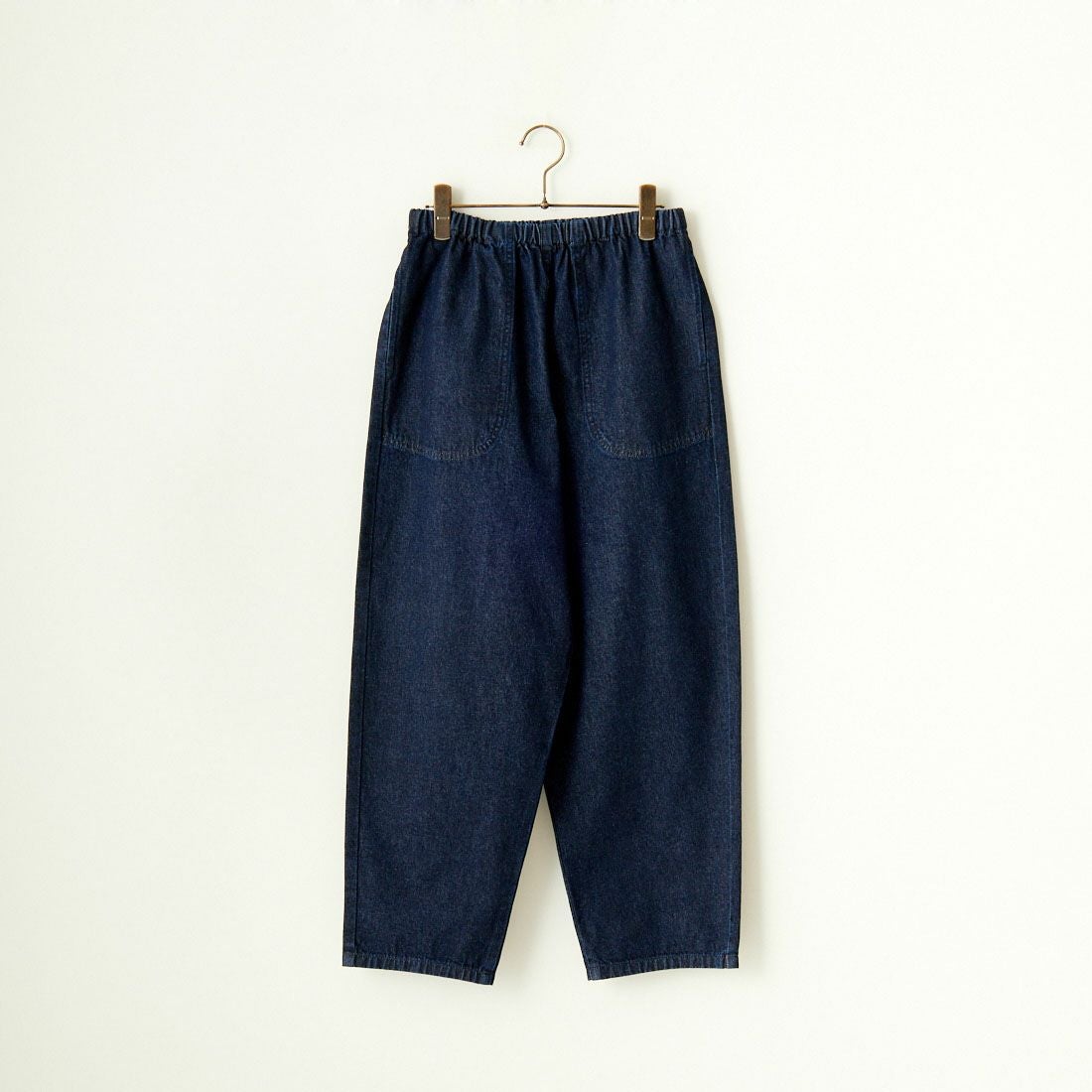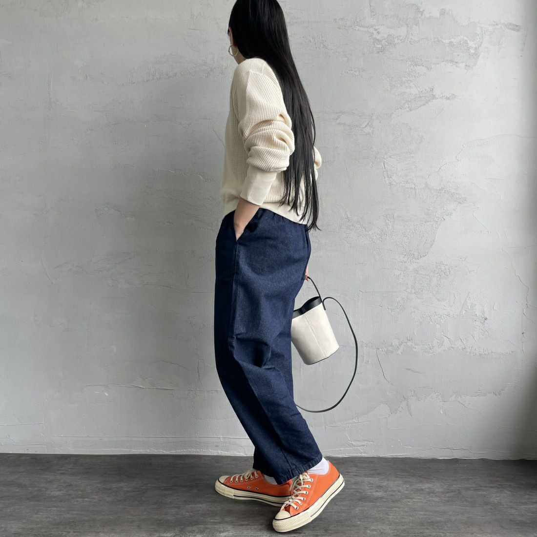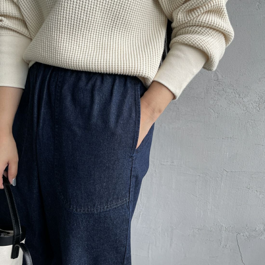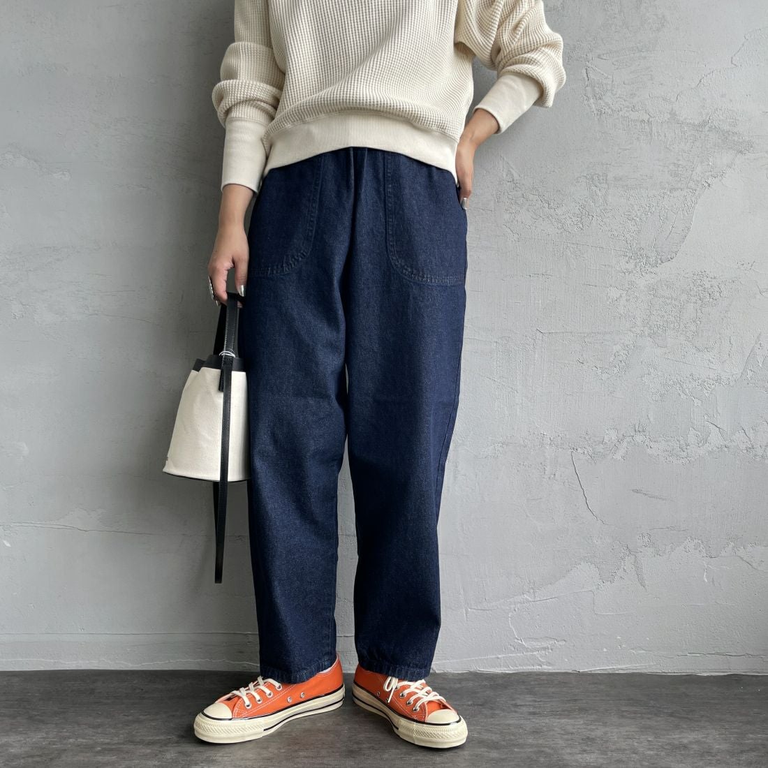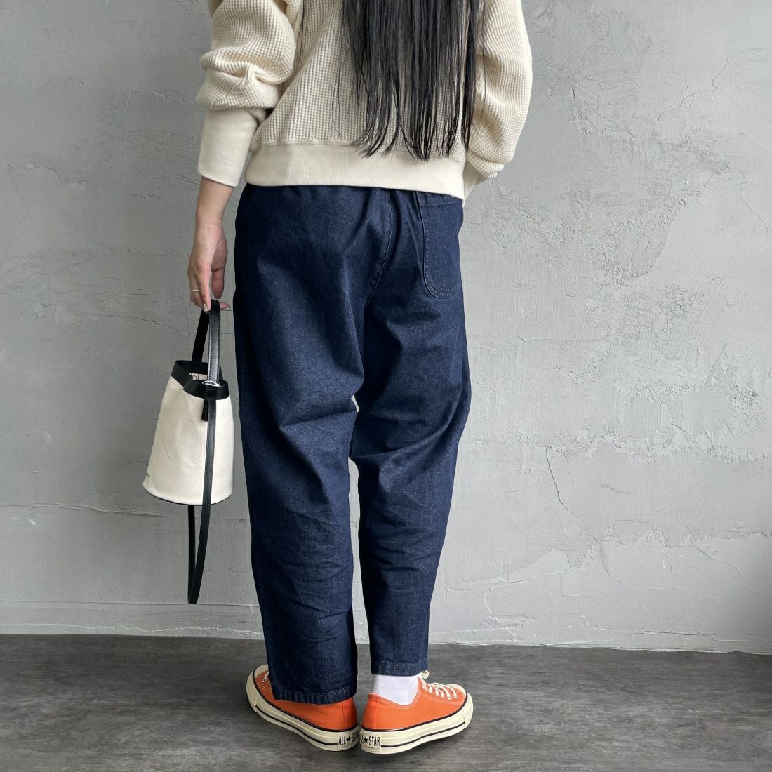 履き心地も軽い、デイリーユースに最適なデニムイージーパンツ。ヴィンテージのデニムを参考にしたナチュラルなムラ感が魅力で、通常の10ozデニムよりもソフトな仕上がりになっています。ウエスト部分は総ゴムのプルオン仕様で、リラックス感のある着心地。裾に向かってテーパードがかかったクロップド丈は、あらゆるトップスと好相性。体型をカバーしつつ、すっきりとしたバランスの良い着こなしが叶います。
