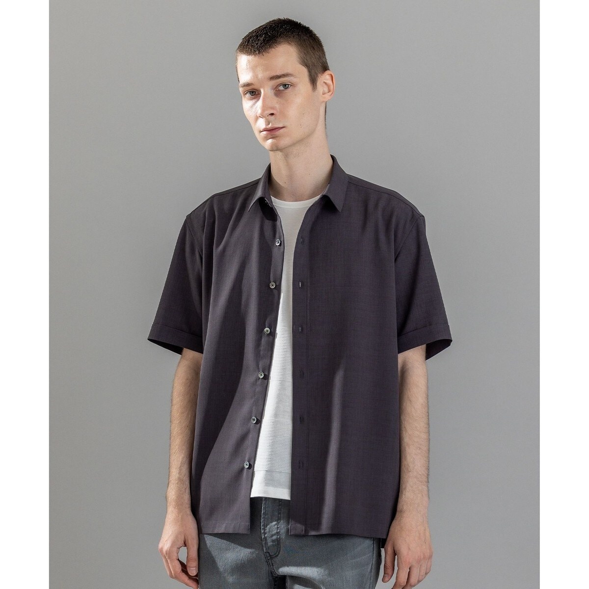 シンプルなレギュラーカラー半袖シャツ。レギュラーカラーでキチンと見えでラフになりすぎない印象。
