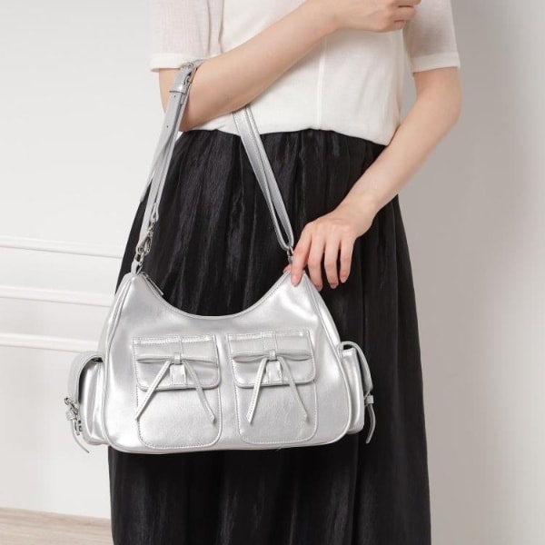 ポケットに付いているリボンが大人ガーリー感を引き立ててくれるバッグです。