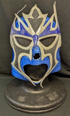 プロレスマスク アンヘルアステカ製【アンヘルアステカ&チャロ ハーフマスク(青ラメ×銀フチ)】タグなし サイン入り 着用写真付き