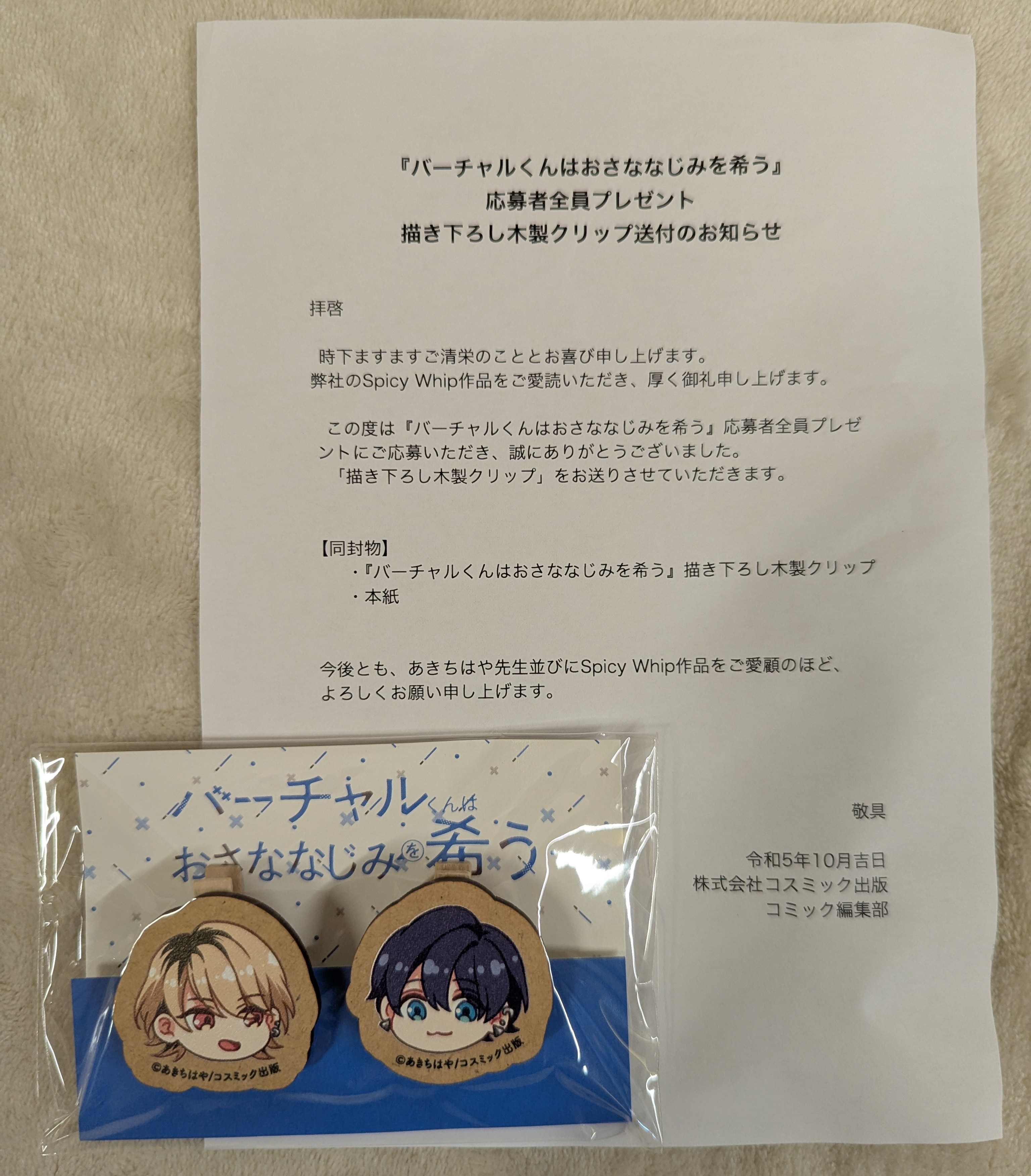 【中古】文房具その他 葵泰那&小野恵太 描き下ろし木製クリップ 「バーチャルくんはおさななじみを希う」 応募者全員サービス