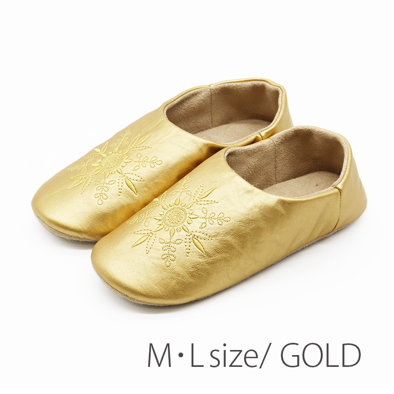 メタリックな風合いにモロッコ風の刺繍を施した、バブーシュタイプのスリッパです。