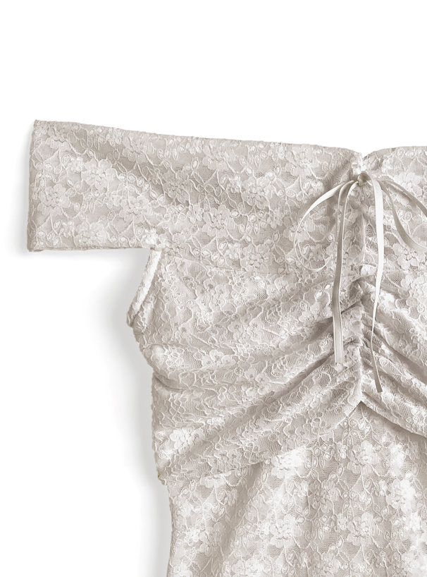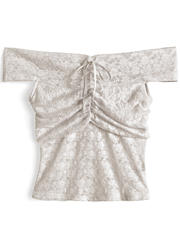 フラワー柄レースが広がる、フェミニンなムード漂うオフショルトップス。