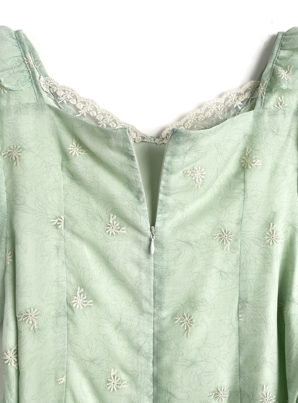 全体にフラワー刺繍をちりばめ、繊細なムードを漂わせるワンピース。