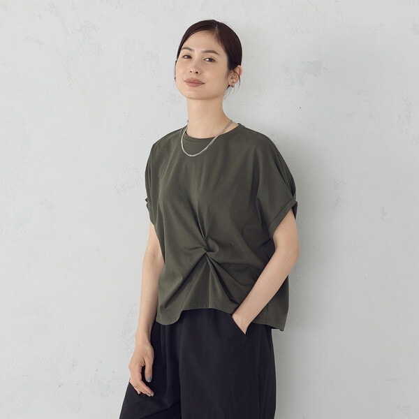 ウエストのツイストが印象的なデザインTシャツ。