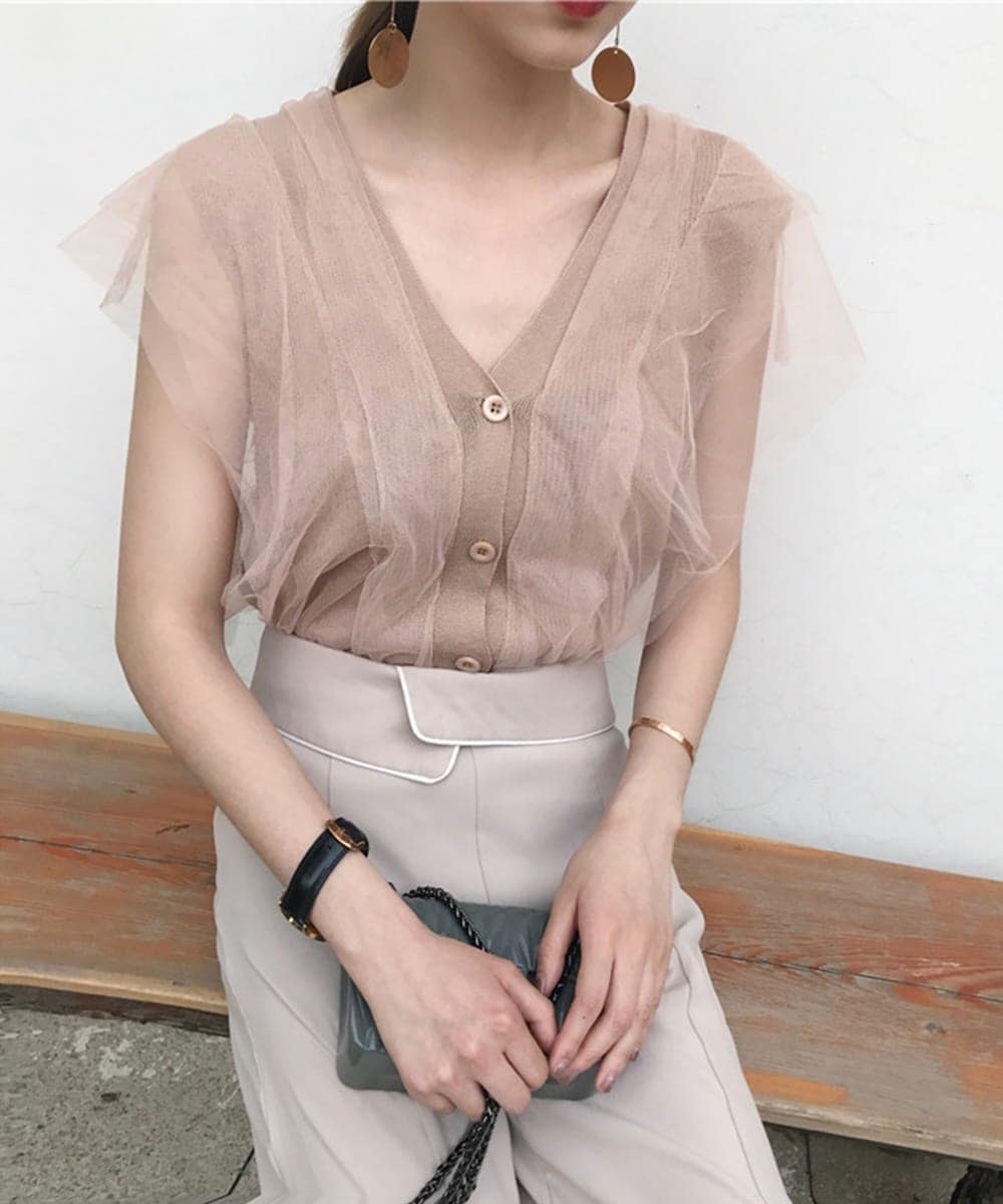 フリルのチュールがが二の腕をうまく隠してくれる華奢見え効果も抜群です。