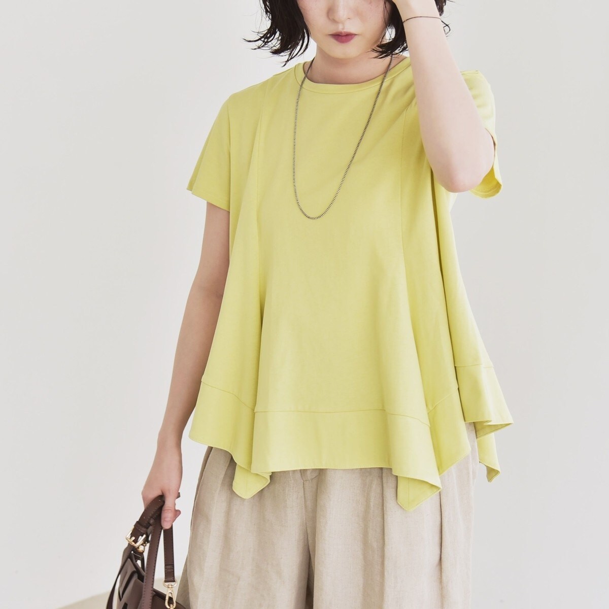 Aラインに広がるハンカチーフヘムで、ベーシックなTシャツよりもフェミニンな印象に。