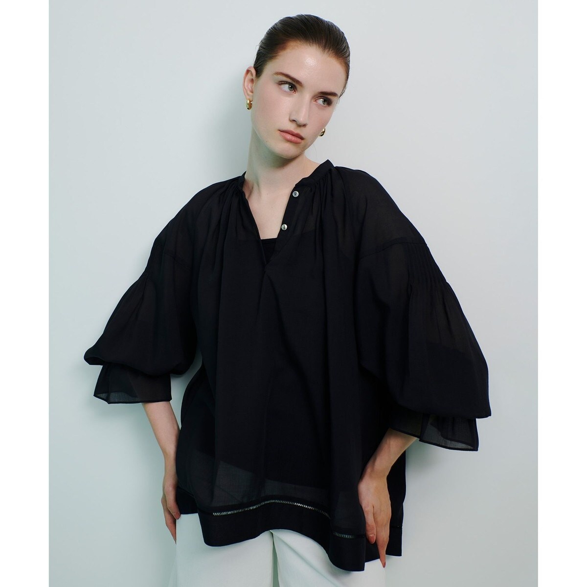 ほどよい透け感のコットンオーガンジー素材のチュニック丈ブラウス。