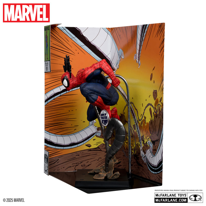 伝説的コミックアーティストであり、マクファーレン・トイズのCEOを務めるトッド・マクファーレンによる、『Marvel Tales Vol.2 #223』のカバーに描かれたスパイダーマンを、1/6スケールの無可動フィギュアとして立体化!細部に至るまで造形や質感にこだわり、カバーアートの特徴的なタッチや構図を再現している。背景が描かれたバックボードが付いてくるので、臨場感溢れるディスプレイが可能だ。台座には、ドクター・オクトパスのアームと「THE ARMS OF DOCTOR OCTOPUS!」の吹き出しが造形されているぞ。また、元になったカバーアートのカードと、原作コミックが付属するのも嬉しいポイント!パッケージは、そのまま飾ってもカッコいいウィンドウボックス仕様だ。