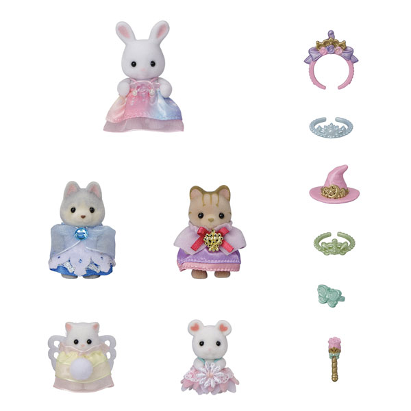 プリンセスのドレスを着た赤ちゃんたちのセットです。 スノープリンセスのハスキーの赤ちゃんや、ユニコーンプリンセスのしろウサギの赤ちゃんなど、かわいいプリンセスがたくさんついています。 それぞれのプリンセスにぴったりなティアラなど小物もついています。