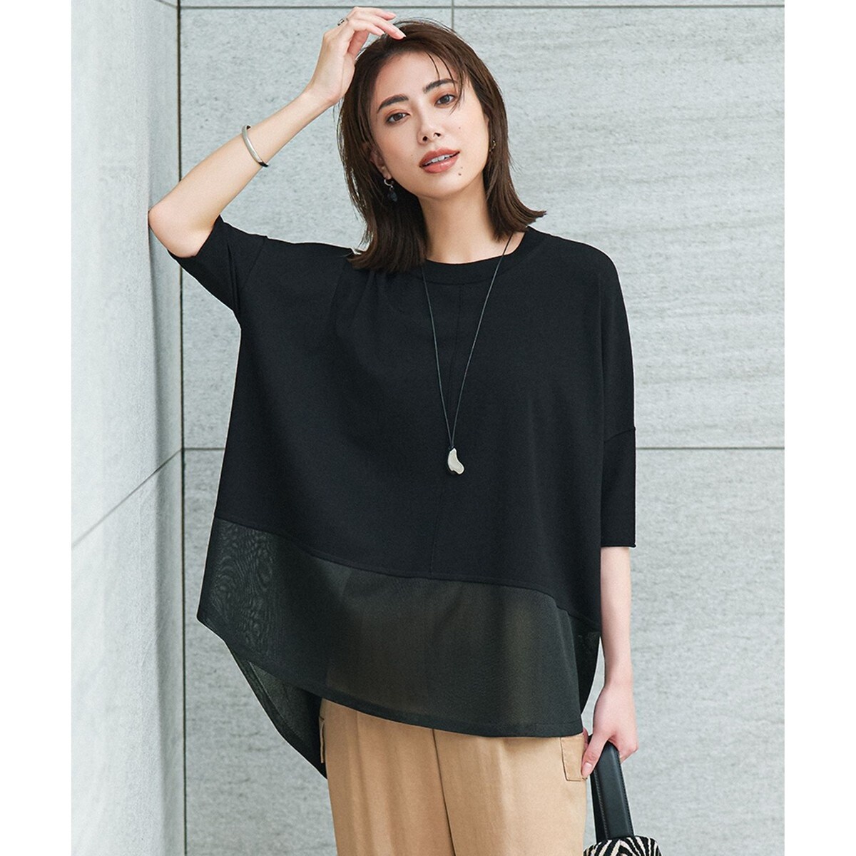 ■デザインICB定番人気のニットにシアー素材をプラスしたプルオーバーニットです。シアー素材は適度にハリコシのある素材で、流れる様なシルエットがモードで洗練された印象に。オーバーシルエットのボディーと細身の袖のメリハリのあるシルエットで『Tシャツ以上ニット未満』の着心地良いプルオーバーに仕立てています。薄手ながら体のラインを拾いにくく体型カバーも叶います。薄手で適度な落ち感もあり、羽織のインナーとしてもお使いいただけます。