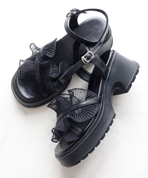 シューズ 合成皮革/人工皮革 / ポリエステル素材 / レース / フリル / 4.5cm~7.5cm未満 / 太めヒール / ふつう(D・E・2E) / スクエアトゥ / マリン・プール / ストラップサンダル / カジュアル / 中敷クッション入り / 脱ぎ履きしやすい / 脱げにくい / 柔らかいソール