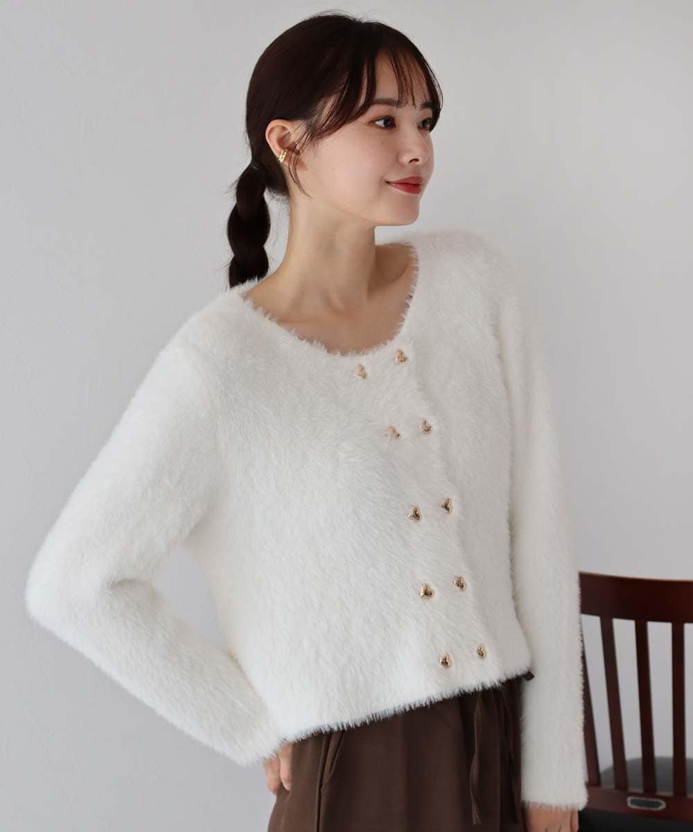 トレンドのハートモチーフをボタンにした大人ガーリーなシャギーニットカーディガン。