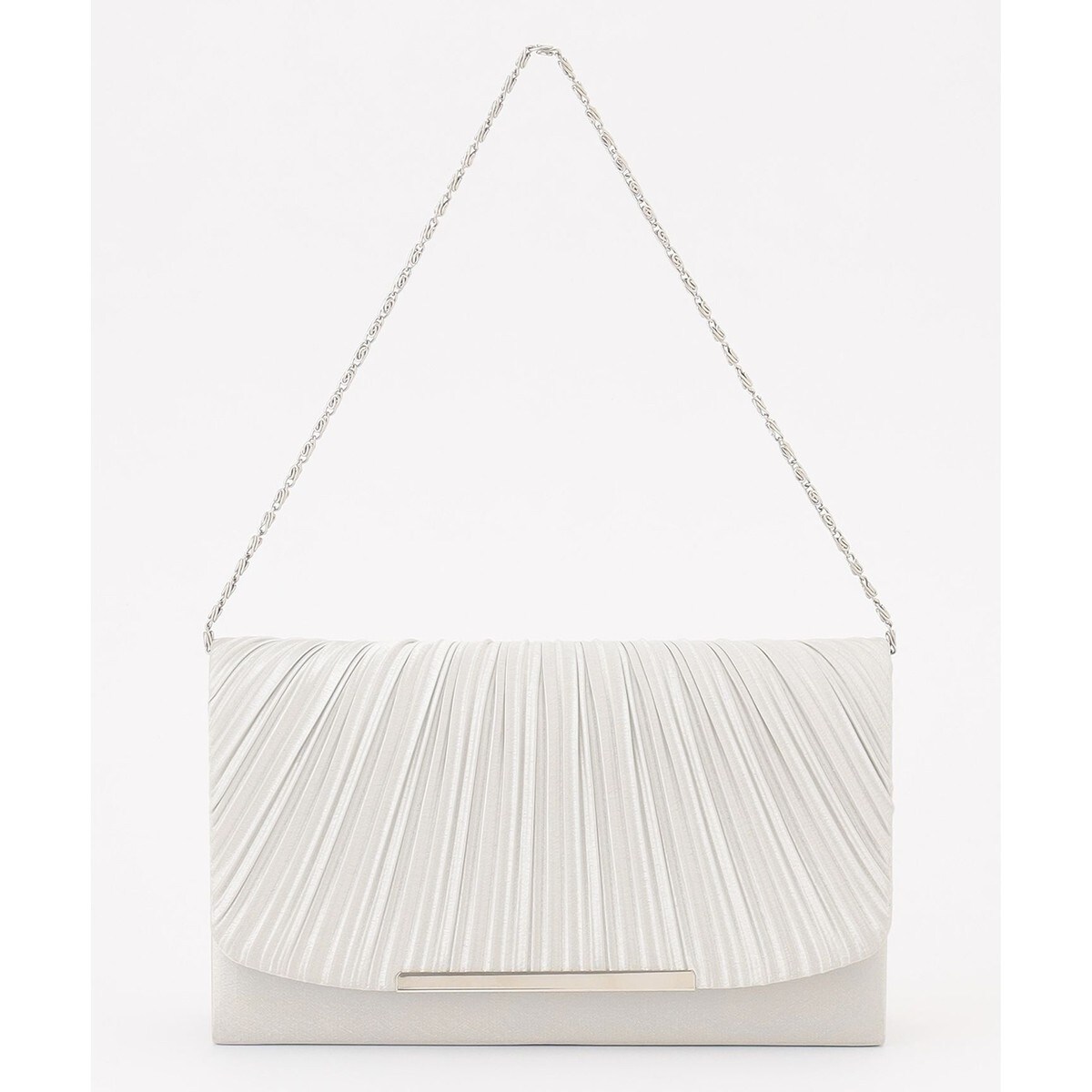 ・細かなプリーツデザインが華やかなパーティバッグ・サテンにプリーツ加工を施した生地を使用し、上品な光沢感がドレスやワンピースにマッチ・華奢なチェーンショルダー付きで、肩掛けも可能・お呼ばれから式典まで活躍するアイテム