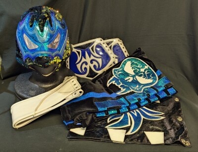 プロレスマスク プロレスコスチュームセット マスクブシオ製【ドラリスティコ (青特殊×金特殊フチ)】本人使用 サイン入り(宛名あり)