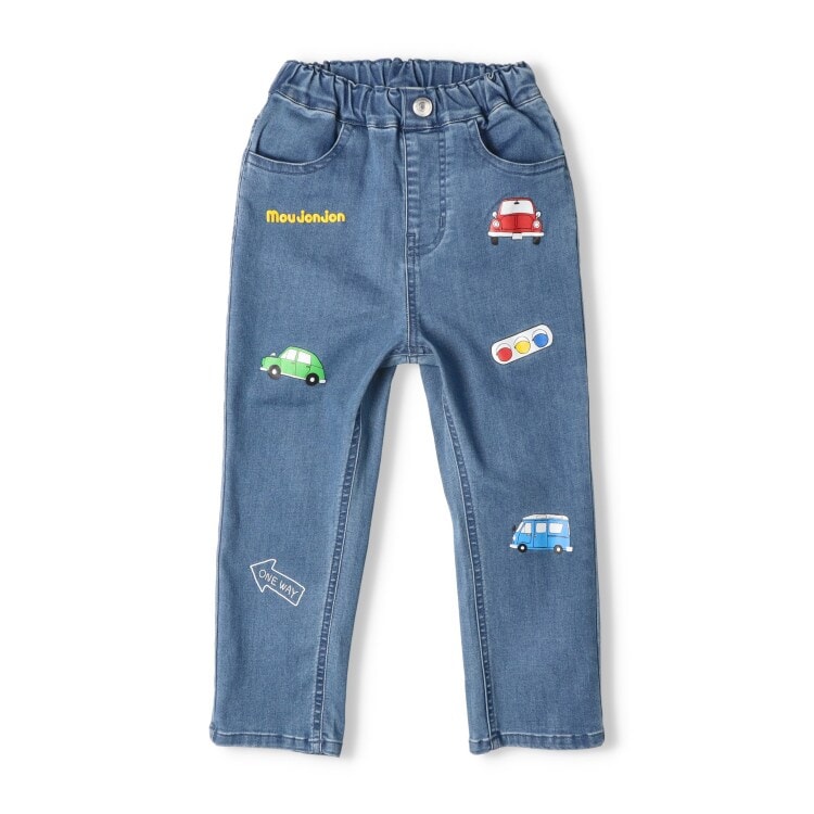 前に車やブランドロゴのプリントが入った遊び心のあるデザイン。ストレッチデニムのストレートシルエットの長パンツ、長ズボン。【アイテム】シンプル ベーシック 無地 カジュアル お洒落 オシャレ かっこいい かわいい 可愛い 普段着 お外着 お外遊び着 デイリーウェア お出かけ着 ロング丈 長丈 長ズボン フル丈 ボトムス 子ども こども 男児 男の子 ボーイズ キッズ ベビーサイズ トドラーサイズ 幼稚園 保育園 小学校 通園 通学 小学生 2025年秋冬物新作 丸高衣料 ブルー 青色 ムージョンジョン Gパン ジーンズ ジーパン