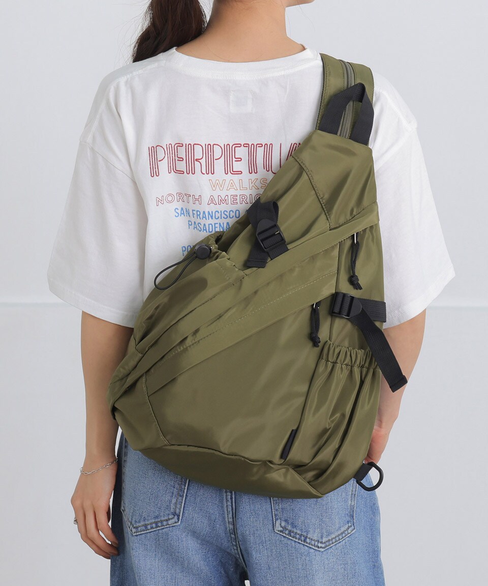 ・ショルダー紐の中央にはファスナーが付いており、ボディバッグからリュックに変身します。
