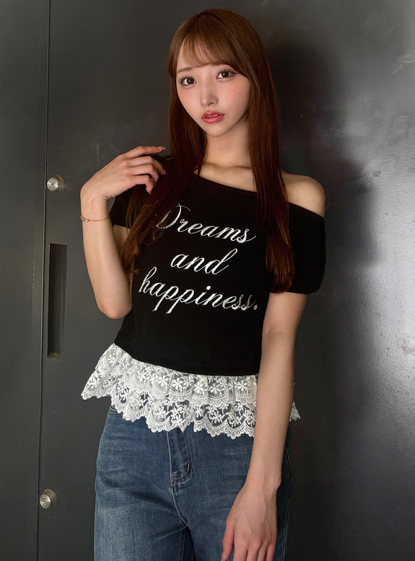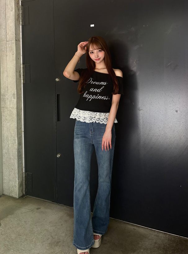 アシメになったオフショルダーで抜け感と女性らしさを表現。