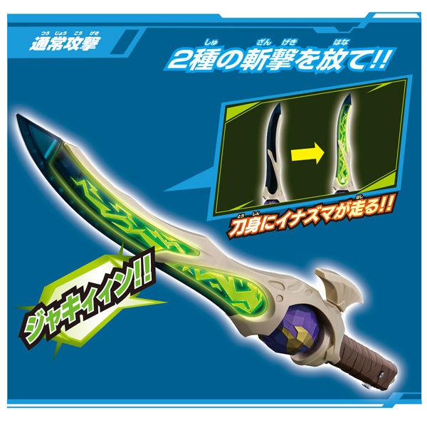 「ウルトラマンブレーザー」が使用する最強武器です。 グリップのレバーを引くと中央の球体が回転。 さらに、レバー操作に応じて刀身全体に雷がほとばしる発光ギミックを内蔵しています。 レバーを引いた回数に応じて遊べる必殺技が変化するほか、後続商品との合体でさらなる音声が解放されます。