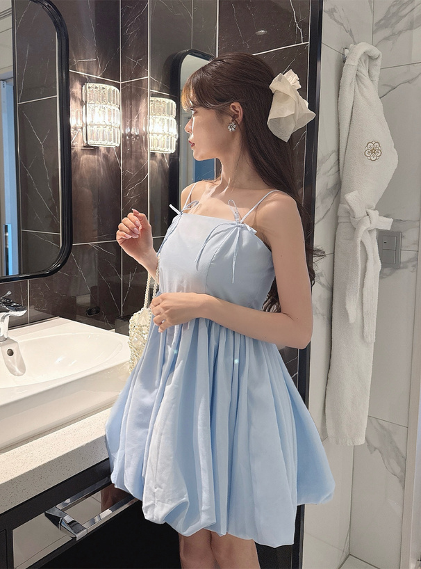 華奢なリボンストラップが、デコルテまわりを繊細に彩る。