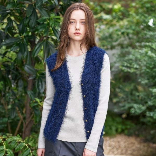編地は、フェザーの糸、ラメ糸、コットン、ストレッチ糸をミックスさせて作られたとても柔らかくてなめらかな風合いのニット。