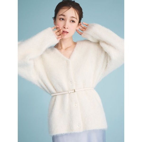 アルパカのふわふわとした柔らかな毛足にミニスパンコールとラメ糸を引き揃え、さりげなく煌めく上品な編地に、同色系のシェル釦を使用した贅沢な1着。