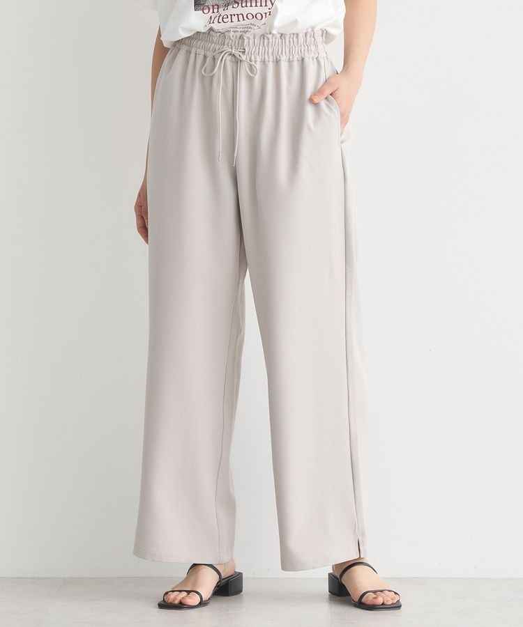 デイリーからお出かけまで幅広く合わせて頂けるシンプルなワイドパンツ。レッグラインを拾わないリラクシーな穿き心地でロングシーズン愛用いただける一本です。ウエストゴム仕様のシャーリングアクセントがタックインでもサマ見え。ワントーンカラーで着回しやすく、様々なスタイリングに活躍してくれるアイテムです。透け感[なし]