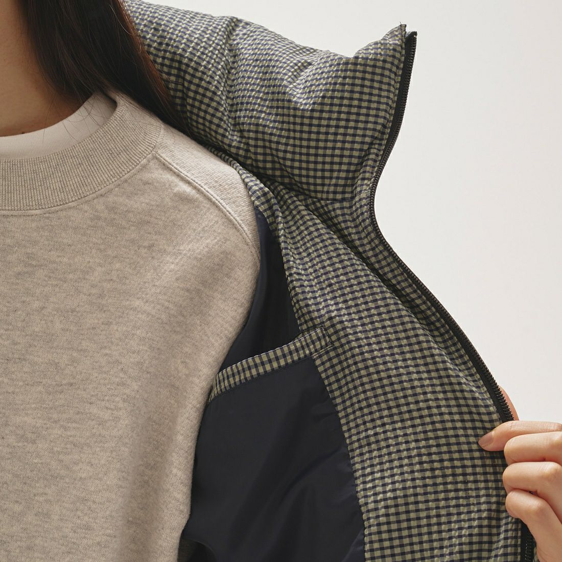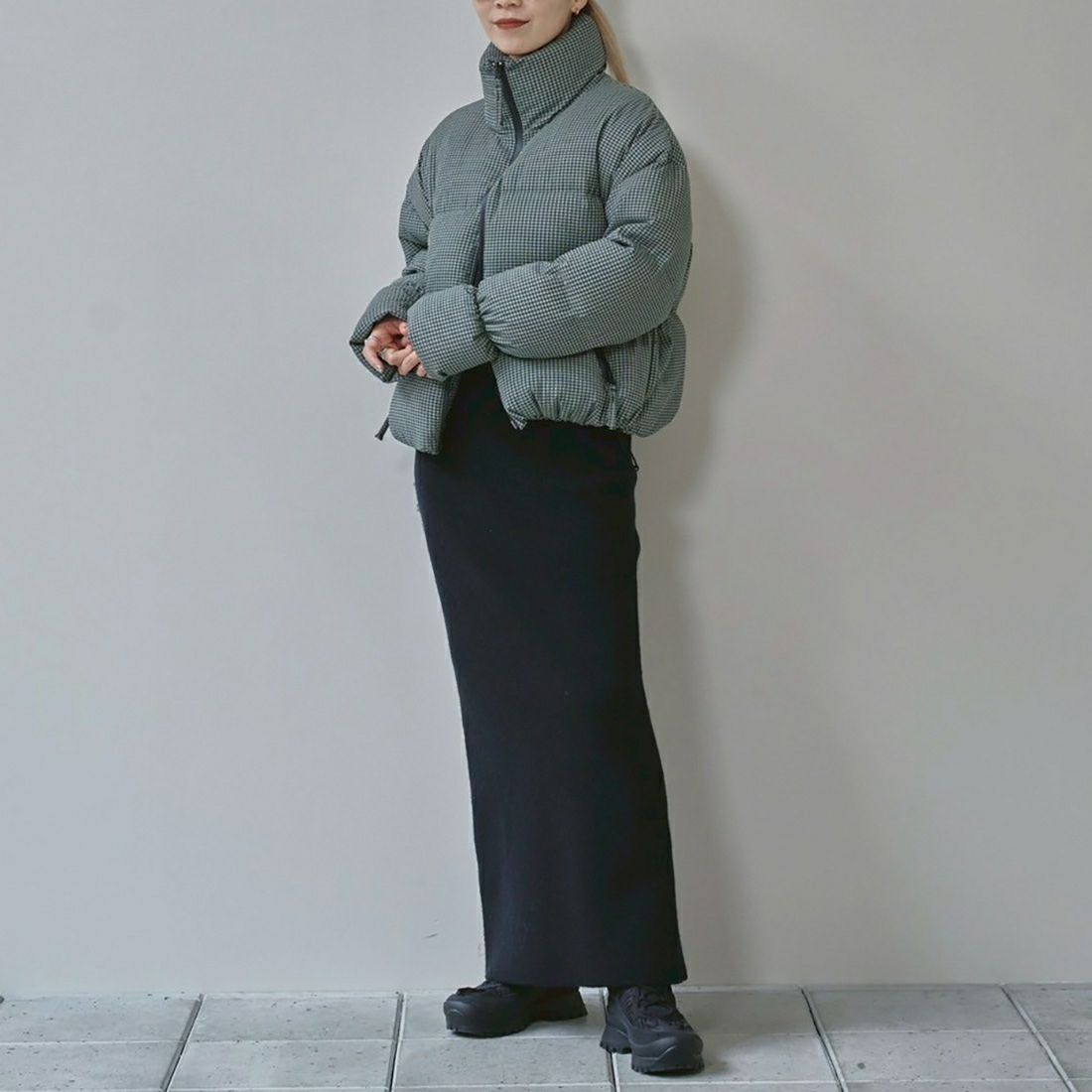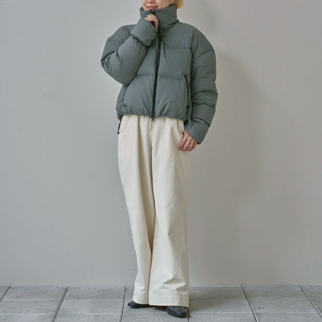 国内のワッシャー感のあるチェック生地を使用したダウンジャケット。程よいボリューム感と、丸みのあるシルエットがカジュアルなアイテムでありながらも女性らしく着こなせる一着。首元まで覆うスタンドネックは寒さをしっかりとガードしてくれます。オリジナルで染め上げたカラーも魅力。シンプルなスタイリングに合わせるだけでこなれた印象に着こなせるアイテムです。