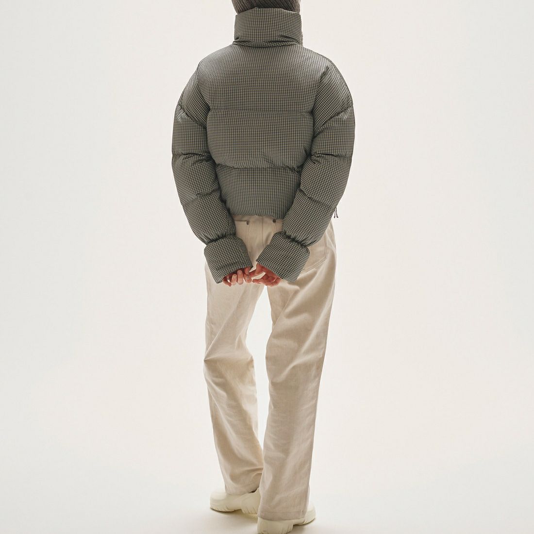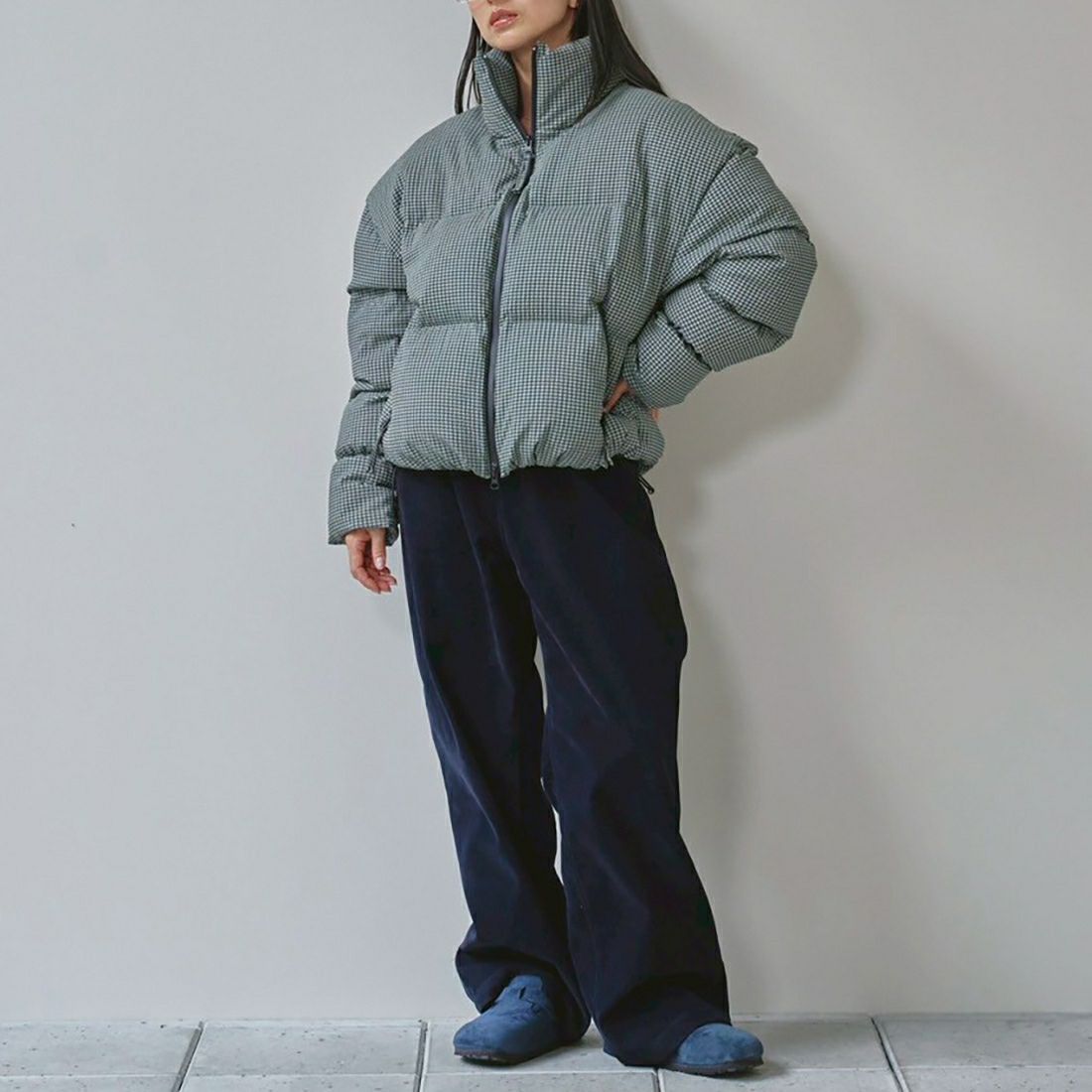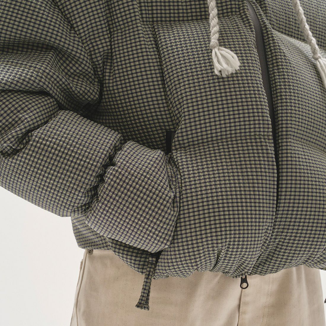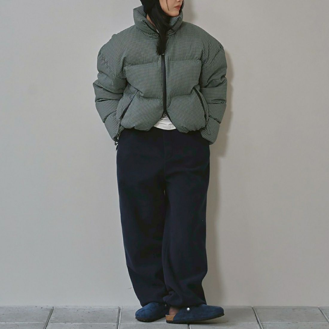 国内のワッシャー感のあるチェック生地を使用したダウンジャケット。程よいボリューム感と、丸みのあるシルエットがカジュアルなアイテムでありながらも女性らしく着こなせる一着。首元まで覆うスタンドネックは寒さをしっかりとガードしてくれます。オリジナルで染め上げたカラーも魅力。シンプルなスタイリングに合わせるだけでこなれた印象に着こなせるアイテムです。